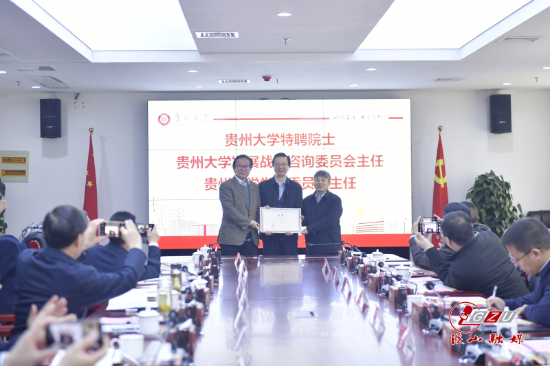 会上,李建军为唐华俊颁发贵州大学特聘院士、贵州大学发展战略咨询委员会主任、贵州大学学术委员会主任聘书。