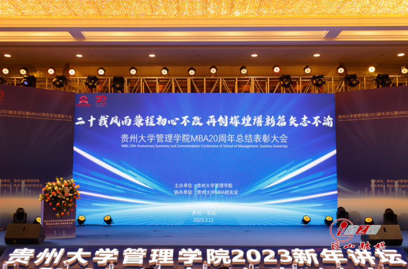 为贯彻落实党的二十大关于“高质量发展是全面建设现代化国家的首要任务”的政策理念,值贵州大学MBA办学二十周年之际,3月11日,我校管理学院分别在学院三楼报告厅、花溪迎宾馆五号楼宴会厅举行校友企业家创新创业论坛、2023新年讲坛暨MBA20周年总结表彰大会。