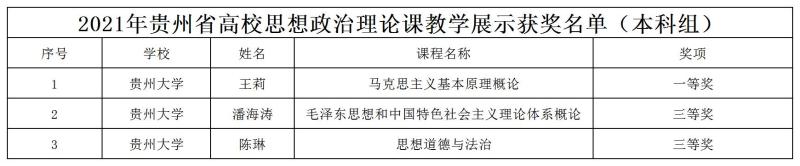 近日,省教育厅公布了2021年贵州省高校思想政治理论课教学展示获奖名单,我校三名教师分别获得本科组一等奖及三等奖,其中王莉获得一等奖,潘海涛、陈琳获得三等奖。