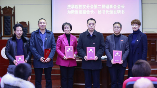 大会审议通过贵州大学法学院校友分会第二届理事会名单,产生以冷传莉为会长,石明昌等为副会长,阮志群为秘书长的第二届理事会。会上为新一届理事会成员颁发了聘书。