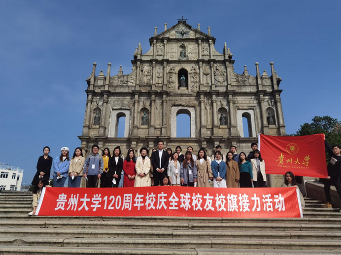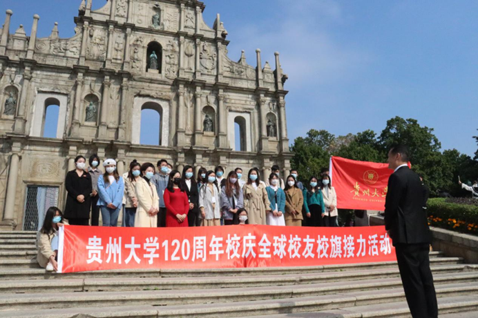 图为贵州大学建校120周年校旗全球接力澳门站活动全体成员合影