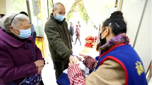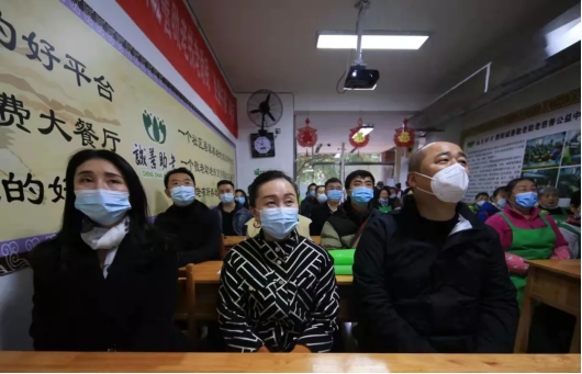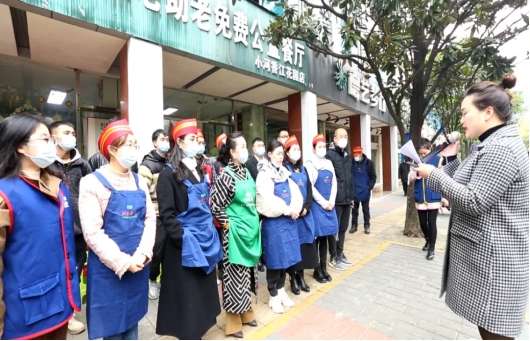 在诚善助老免费餐厅里,见习理事长张馨,店长唐先惠、李彩霞组织志愿者进行上岗前准备、餐前准备。志愿者代表孙志杉跟着餐厅工作人员前往西工厂小区为行动不便、高龄老人送餐。