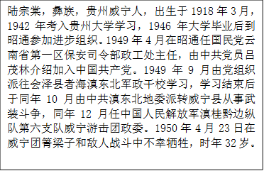解放前夕,地处黔西北山区的威宁县境内活跃着一支由共产党领导的武装队伍——中国人民解放军滇桂黔边区纵队第六支队威宁游击团,这支队伍的创始人就是英烈陆宗棠。在党的领导下,陆宗棠率领这支队伍,为保卫威宁至昭通公路畅通,维护地方稳定进行了艰苦的斗争。