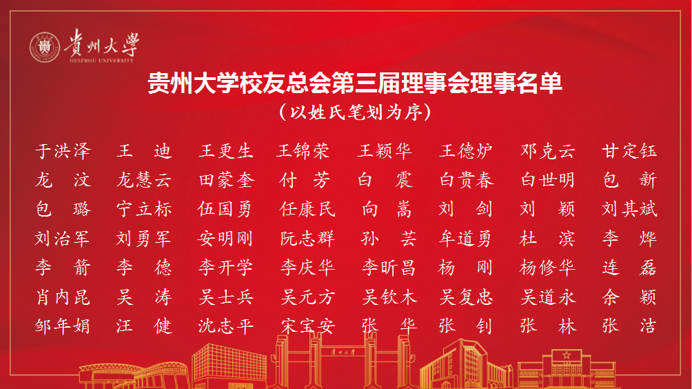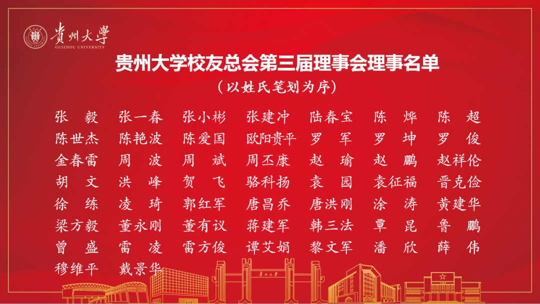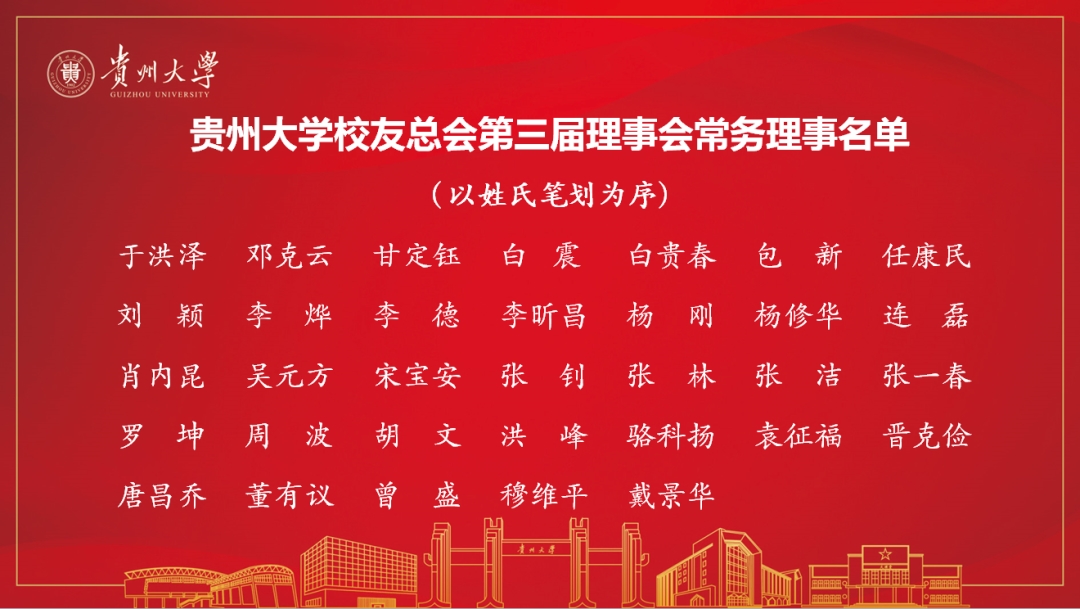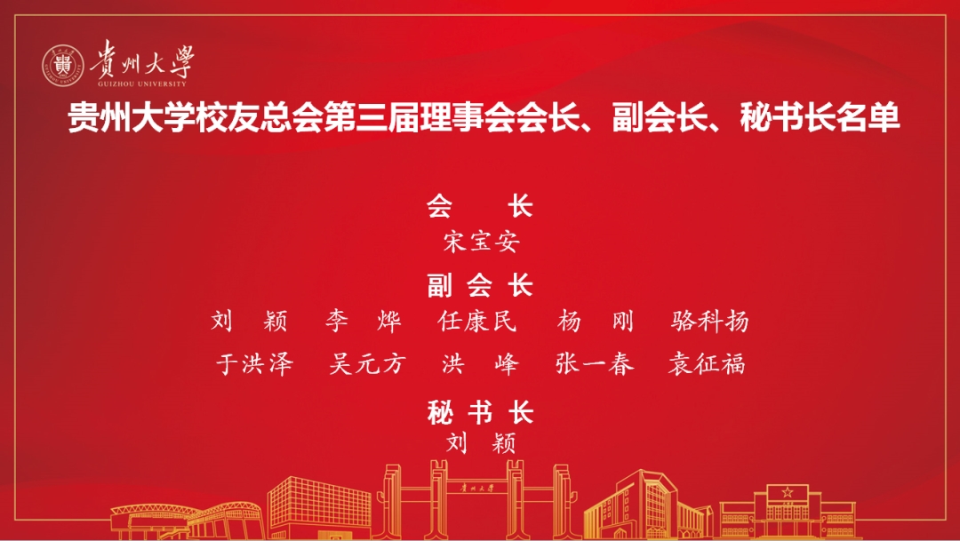 会上选举产生了贵州大学校友总会第三届理事会理事、监事;贵州大学校友总会第三届理事会常务理事;贵州大学校友总会第三届理事会会长、副会长、秘书长,审议通过副秘书长名单。