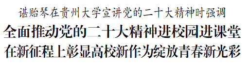 11月15日,省委书记、省人大常委会主任谌贻琴到贵州大学宣讲党的二十大精神和省委十三届二次全会精神,并向贵州大学建校120周年表示热烈祝贺。她强调,全省高校要把学习宣传贯彻党的二十大精神作为当前和今后一个时期的首要政治任务,原原本本抓学习,认认真真抓宣传,扎扎实实抓贯彻,推动党的二十大精神进校园、进课堂、进头脑,在现代化建设新征程上彰显高校新作为、绽放青春新光彩。
