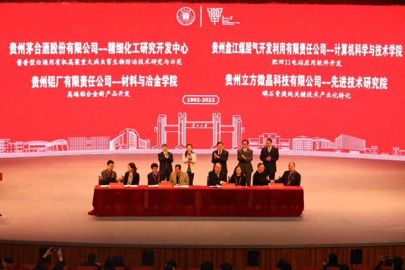 贵州茅台酒股份有限公司、贵州铝厂有限责任公司、贵州盘江煤层气开发利用有限责任公司、贵州立方微晶科技有限公司、贵州图智信息技术有限公司、贵州能源产业研究院有限公司、贵州金沙窖酒酒业有限公司、贵州黄牛产业集团科技服务有限公司分别与我校精细化工研究开发中心、材料与冶金学院、计算机科学与技术学院、先进技术研究院、省部共建公共大数据国家重点实验室、资源与环境工程学院、酿酒与食品工程学院、动物科学学院签署重点项目合作协议。八个签署项目总经费共4250万元。