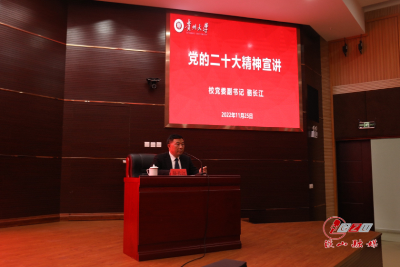 11月25日,校党委副书记骆长江在贤正楼107报告厅为分管职能部门、党外人士、溪山青语研究生宣讲团、青年讲师团、辅导员传习社、大学生宣讲团成员作党的二十大精神宣讲。骆长江指出,从党的十八大开始,中国特色社会主义进入新时代。10年来,以习近平同志为核心的党中央采取一系列战略性举措,推进一系列变革性实践,实现一系列突破性进展,取得一系列标志性成果,经受住了来自政治、经济、意识形态、自然界等方面的风险挑战考验,党和国家事业取得历史性成就、发生历史性变革,推动我国迈上全面建设社会主义现代化国家新征程。党的二十大报告从16个方面对新时代党和国家事业取得历史性成就、发生历史性变革进行了全面总结和精辟概括。广大党员干部要坚持以习近平新时代中国特色社会主义思想为指导,深入学习贯彻习近平新时代中国特色社会主义思想和党的二十大精神,围绕学校“双一流”建设工作和做强贵州大学目标,作出新时代新征程上贵大人的新贡献。