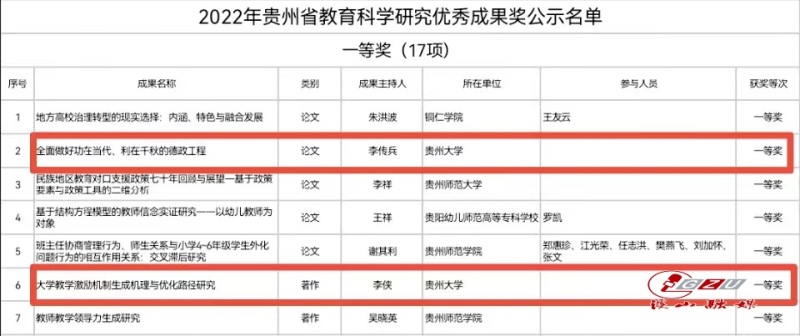 近日,2022年贵州省教育科学研究优秀成果奖拟获奖名单公示,我校马克思主义学院副院长李传兵、经济学院副教授李侠拟获一等奖,国际教育学院院长张成霞,心理健康教育与咨询中心副教授、国家二级心理咨询师杨满云及其团队拟获三等奖。
