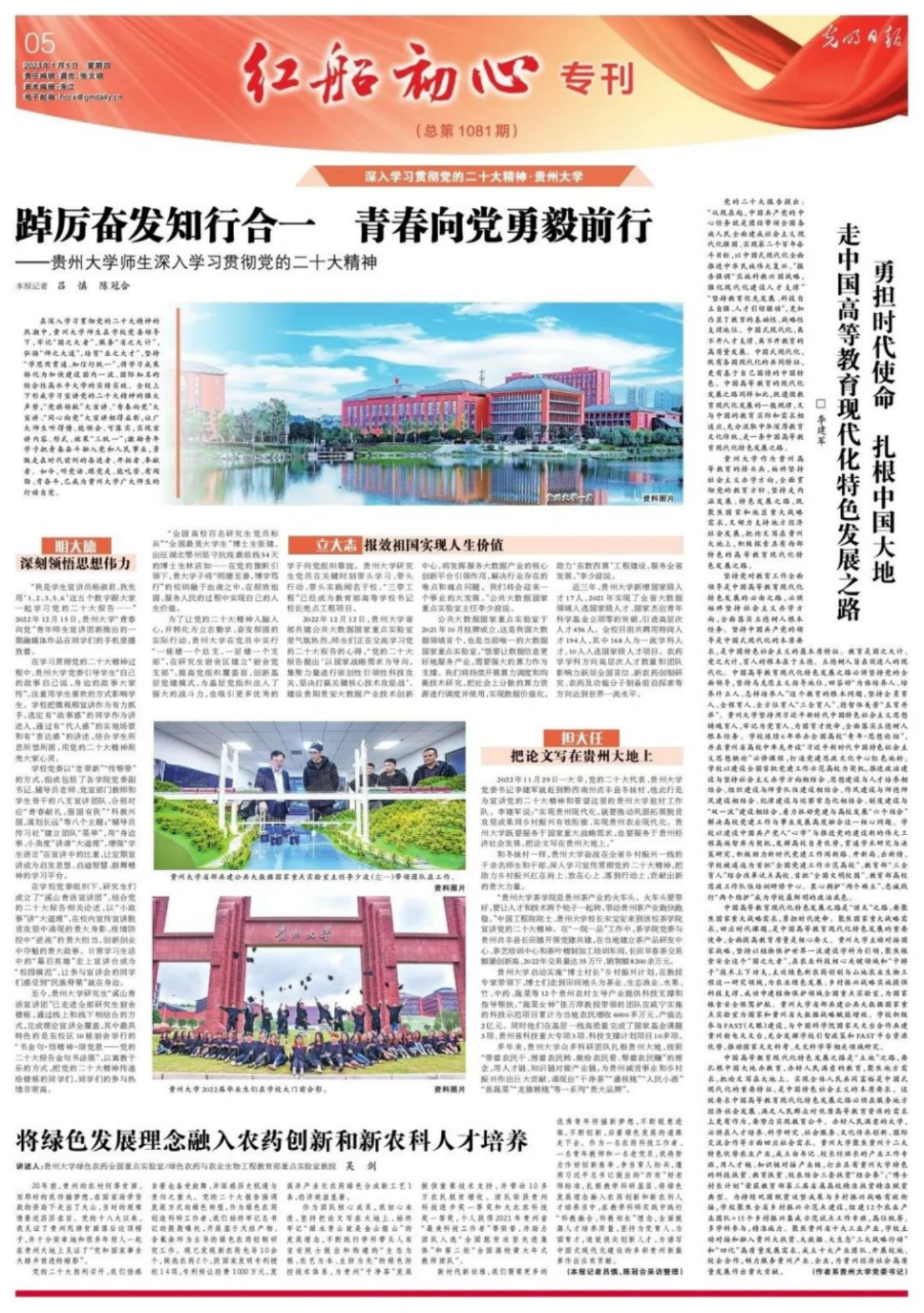 贵州大学作为贵州高等教育的排头兵,始终坚持社会主义办学方向,全面贯彻党的教育方针,坚持走内涵发展、特色发展之路,既聚焦国家和地区重大战略需求,又倾力支持地方经济社会发展,把论文写在贵州大地上,积极探索具有西部特色的高等教育现代化特色发展之路。