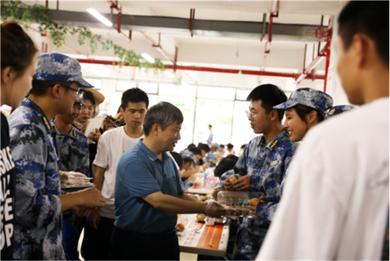 在西校区五食堂,校长宋宝安院士来到同学们中间,为同学们分月饼、送祝福。他与旅游与文化产业学院2019级的学生交流军训感受,希望同学们好好学习,不断培养作为中外合作办学学生的国际视野和家国情怀。
