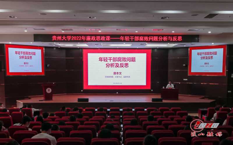 6月23日下午,贵州大学2022年廉政思政课在西校区贤正楼107报告厅开课,校纪委书记、监察专员唐本文以“预防年轻干部腐败问题分析及反思”为主题展开讲授。