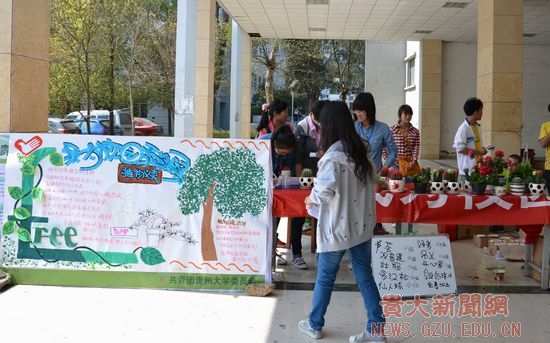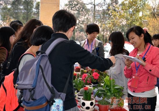 3月12日,在北区逸夫楼附近,青年志愿者协会发起了“我为校园添抹绿”的义卖活动。