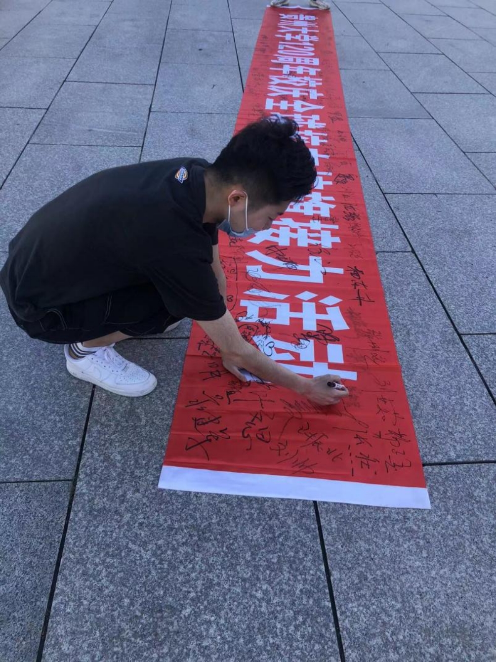 随后两位校友依次在“贵州大学120周年校庆全球校友校旗接力活动”的横幅上签下自己的姓名,表达了对母校的祝福。