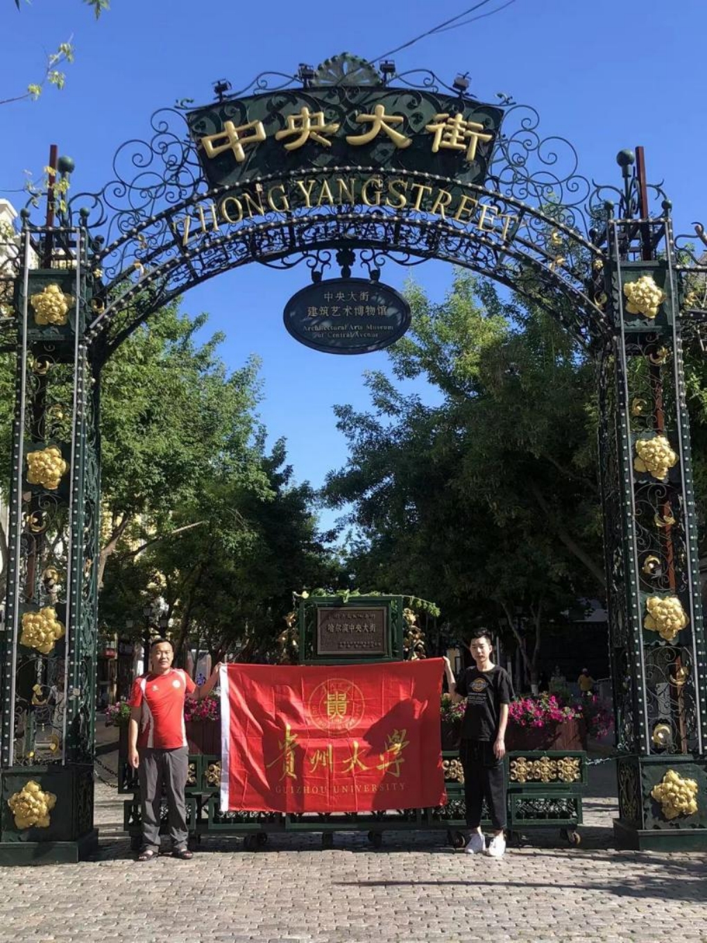 2022年6月21日,贵州大学“百廿贵大 赓续华章”贵大校旗全球接力传递到达祖国最东省份——黑龙江省,到达第一个把阳光迎进中国的地级市——双鸭山市,开启了校旗传递的第十五站。由于疫情的影响,在更改了数次活动时间,克服了种种困难,范树印、郭新宇两位校友终于相聚哈尔滨地标建筑中央大街,共同表达对母校生日的祝福。
