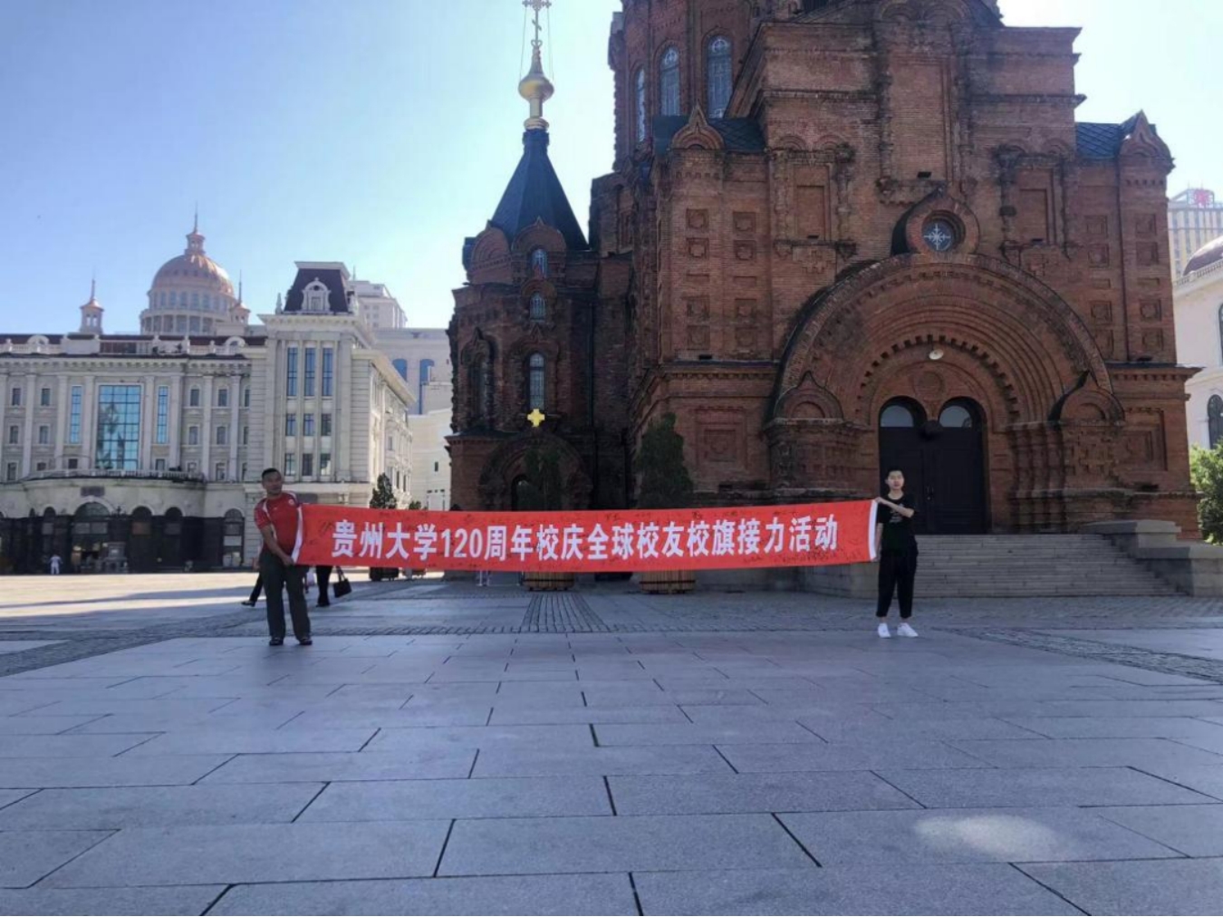 活动当天,两位校友到达约定地点,挥舞着校旗,走过中央大街。紫气东来,当第一缕阳光照射在贵州大学校旗上,耀眼夺目,自豪之情油然而生。