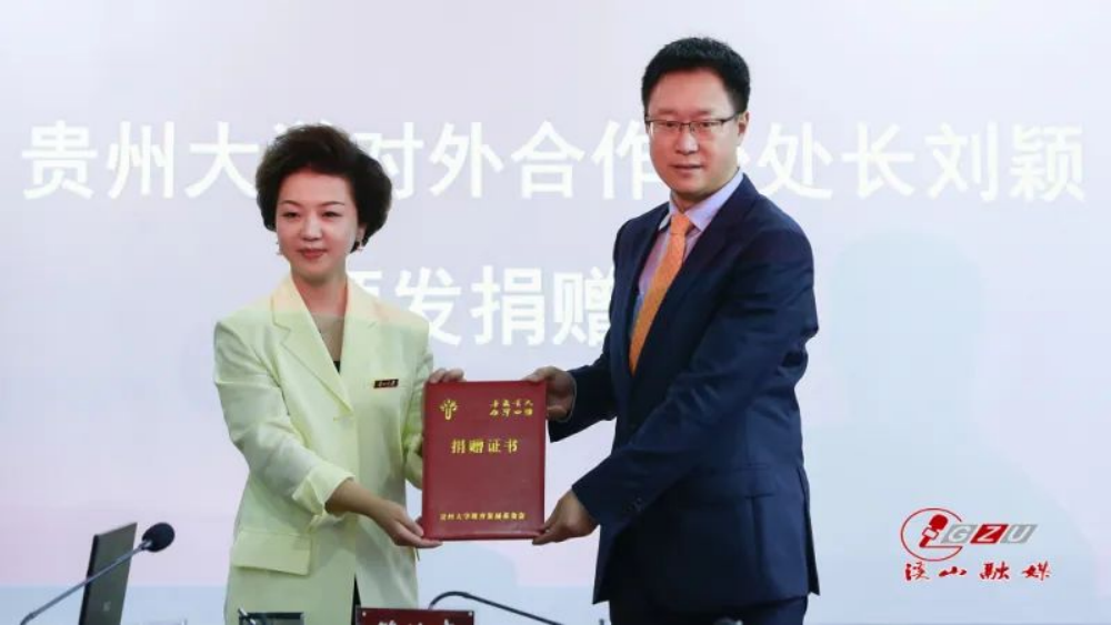 对外合作处处长、贵州大学教育发展基金会秘书长刘颖代表学校向汪晓迅颁发捐赠证书。