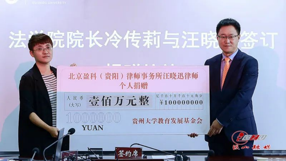 6月8日下午,汪晓迅校友捐赠仪式暨法学院职工与校友之家揭牌仪式在东校区逸夫楼举行。法学院93级校友、贵州省律师协会副会长、北京盈科(贵阳)律师事务所合伙人汪晓迅个人出资100万元设立贵州大学法学院“谦逊·爱心”校友发展基金,用于支持法学院学科建设、人才培养、科学研究、文化建设等内涵式建设项目。