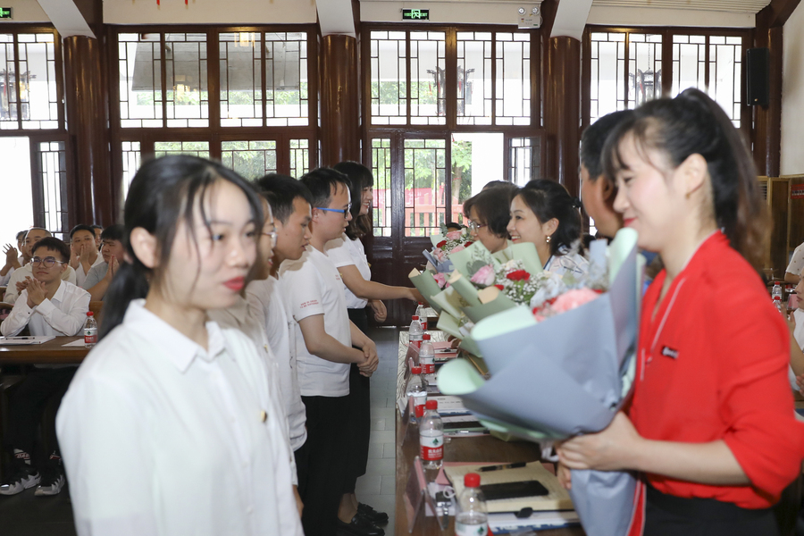 会后,毕业生代表为在场老师献上鲜花,师生共同合唱《贵州大学校歌》。
