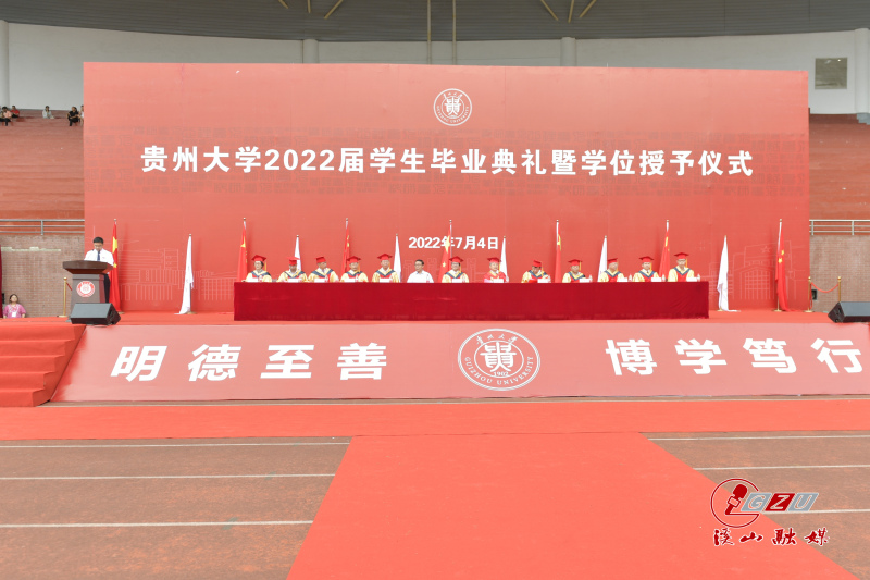 7月4日上午,贵州大学2022届学生毕业典礼暨学位授予仪式在西校区体育场举行。校领导李建军、宋宝安、骆长江、令狐彩桃、唐本文、李军旗、漆思、周少奇、张大林、陈祥盛、吴攀出席典礼,共同欢送毕业生。
