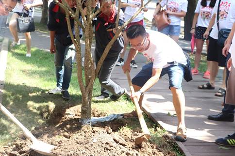 在班会的小叙同学情后,校友们按计划来到了北校区大礼堂前,早早准备好的纪念树已摆放在路旁,校友们在签名墙留下自己的名字并各自合影留念后,合众人之力种下了代表98级信息专业的“友谊之树”。这一刻,笑容在每位校友的脸上荡漾开来。