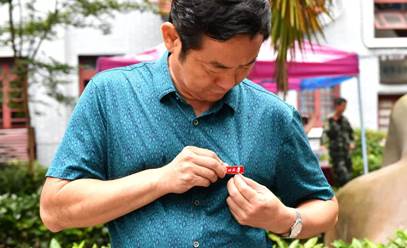 龙超云校友持锤掌錾将纪念石“文”字未完一画凿开并填满色漆