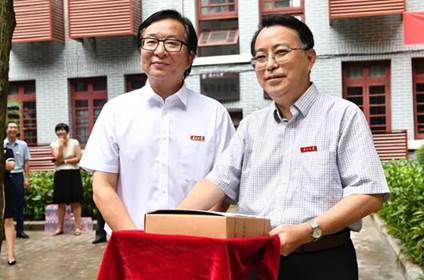 龙超云与李建军共同为“文心在兹”纪念石揭幕,纪念石立于北校区思贤楼(原中文系小楼)前的草坪上。
