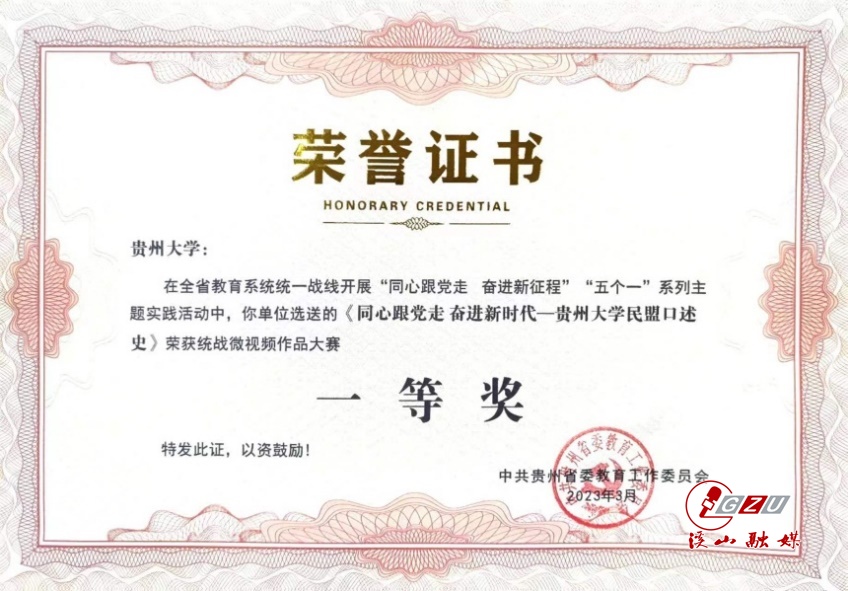 为深入贯彻党的二十大精神和习近平总书记关于做好新时代党的统一战线工作的重要思想,贵州省委教育工委在全省教育系统统一战线开展了“喜迎二十大 同心跟党走 奋进新征程”“五个一”系列主题实践活动。我校选送的统战视频作品《同心跟党走 奋进新时代——贵州大学民盟口述史》荣获“统战视频”项目一等奖,选派的五名教师组成的代表队荣获“统战知识竞赛”项目二等奖。