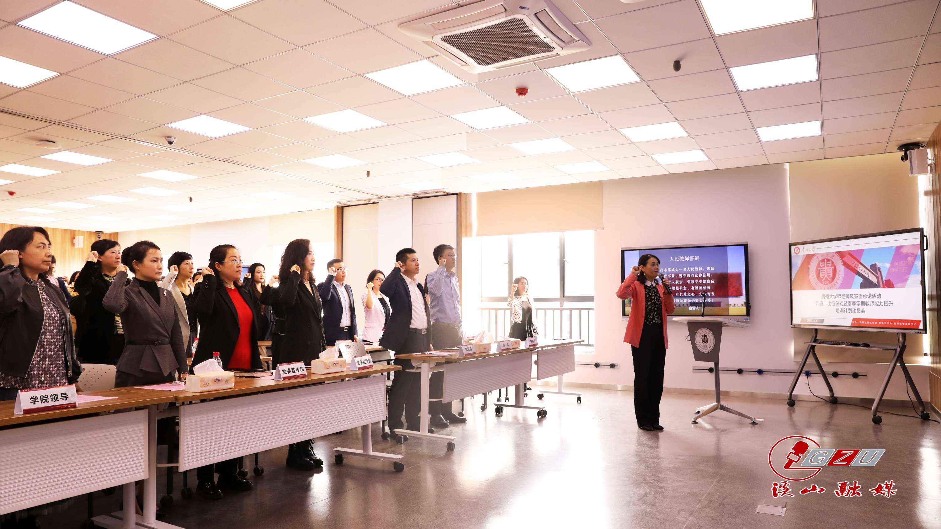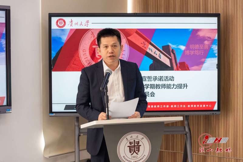 4月13日上午,贵州大学师德师风宣誓承诺活动“两赛”(第六届全国高校青年教师教学竞赛、第三届全国教师教学创新大赛)出征仪式暨春季学期教师能力提升培训计划动员会在西校区德正楼举行。副校长陈祥盛出席会议,党委组织部、党委宣传部、党委教师工作部、教务处主要负责人、教练组全体成员、参赛教师及有关学院负责人参会。
