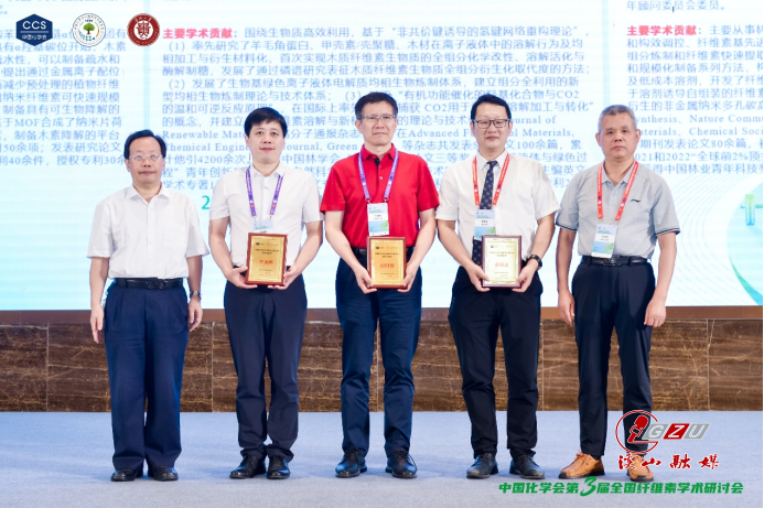 开幕式随后举行首届中国化学会纤维素专业委员会颁奖仪式,颁发了张俐娜奖(终生成就奖)、创新贡献奖、新锐奖。我校谢海波教授获得创新贡献奖。