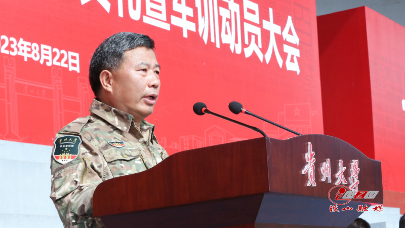 副校长、军训师师长张大林作军训动员讲话。他指出,将军事课作为新生入学第一课,旨在通过军事技能训练和军事理论课教学,激发大学生爱国热情、磨练意志品质、增强组织纪律、培养优良作风。同学们要强化理想信念,勇担时代使命,充分展示贵大学子朝气蓬勃的精神风貌,用青春和汗水书写新时代青春之歌!