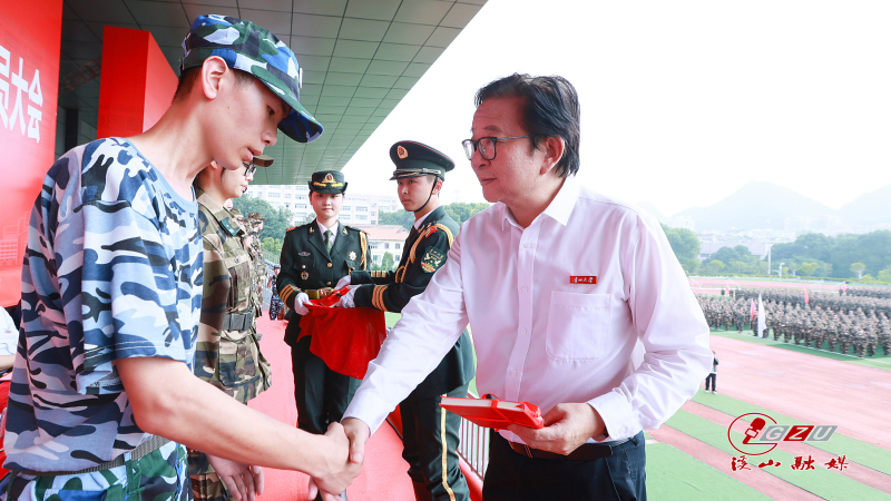李建军为军训师授旗,副校长、军训师师长陈祥盛接旗。