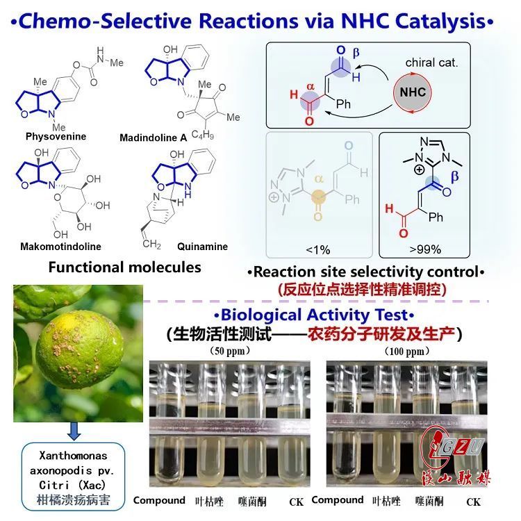 第一篇工作(图2)实现了NHC催化的不对称烯二醛化学选择性控制反应,并观察到化学选择性主要通过底物/催化剂的氧化还原性质来控制,通过LC-HRMS表征及DFT计算排除了反应体系空间位阻对选择性的影响。可以对化合物分子中相似官能团之间的选择性反应进行精准调控。该方法可获得高光学纯度的手性呋喃[2,3-b]吡咯产物,同时,该系列手性化合物也表现出明显的抗柑橘溃疡细菌活性。