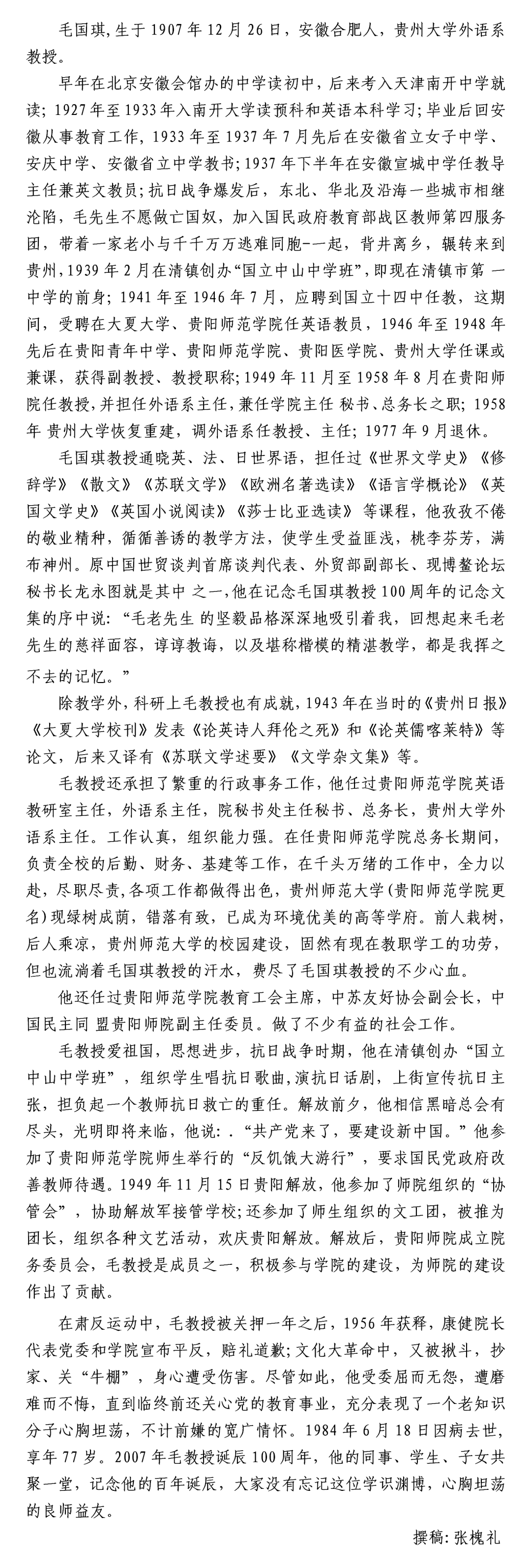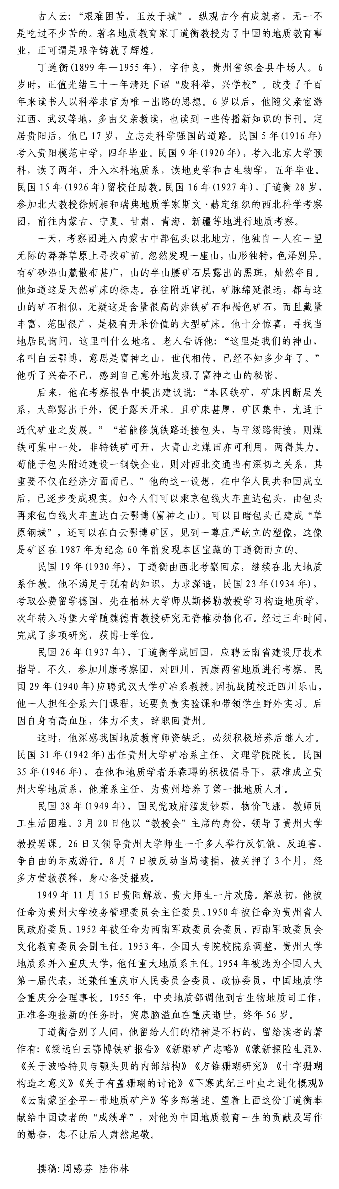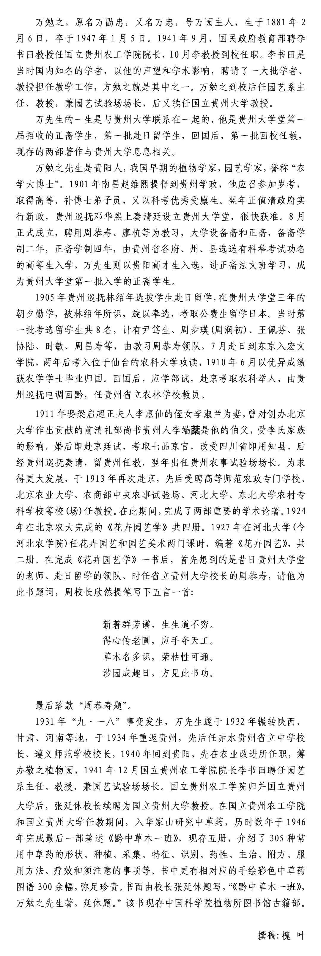 在贵州大学建设和发展的历史长河中,涌现了一大批德高望重,知识渊博,勇攀科技高峰的老师,他们培养了万千学子,创造了贵州大学的历史,书写了贵州大学的辉煌篇章。从他们有形的事迹中,我们看到了无形的精神:强烈的爱国主义精神,忠于职守的敬业精神,身处逆境的奋斗精神,甘为人梯的奉献精神和勇于探索的创新精神。社会在发展,科技在进步,今天的环境、学校规模、专业内容与这些老教授们所处的时代有了很大的变化,但他们作为中国知识分子的优秀代表所体现的精神是不朽的,是我们今天还需要大力弘扬的。他们记载了贵州大学曾经的辉煌,我们要以他们为楷模,再创贵州大学新的辉煌。