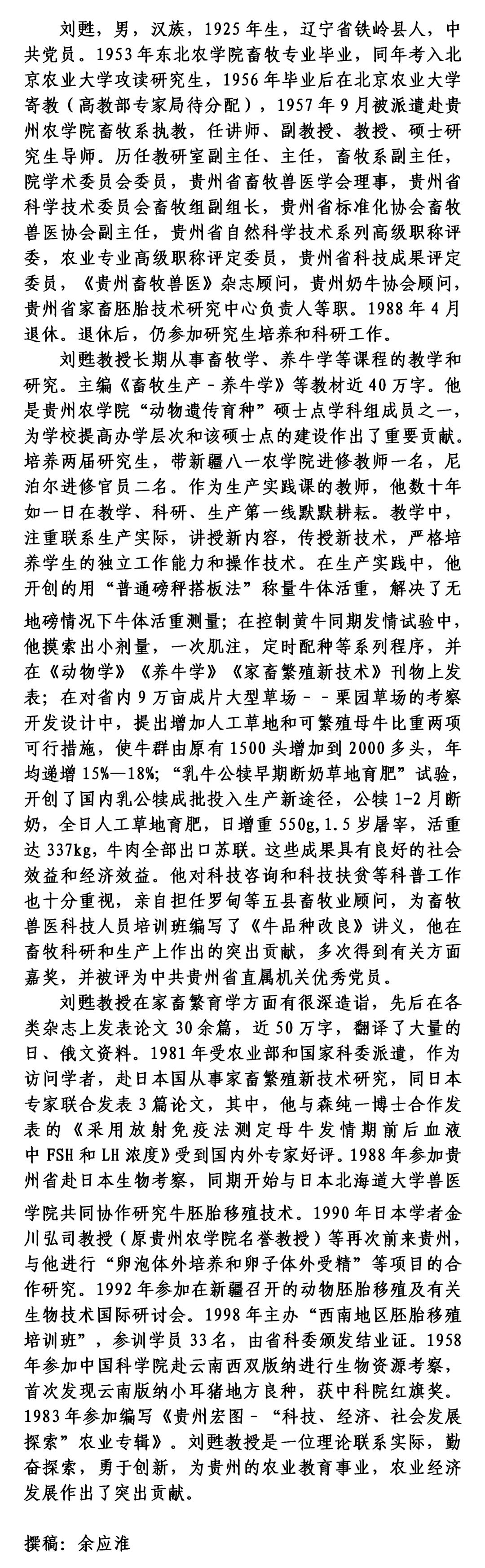 在贵州大学建设和发展的历史长河中,涌现了一大批德高望重,知识渊博,勇攀科技高峰的老师,他们培养了万千学子,创造了贵州大学的历史,书写了贵州大学的辉煌篇章。从他们有形的事迹中,我们看到了无形的精神:强烈的爱国主义精神,忠于职守的敬业精神,身处逆境的奋斗精神,甘为人梯的奉献精神和勇于探索的创新精神。社会在发展,科技在进步,今天的环境、学校规模、专业内容与这些老教授们所处的时代有了很大的变化。他们作为中国知识分子的优秀代表所体现的精神是不朽的,是我们今天还需要大力弘扬的。他们记载了贵州大学曾经的辉煌,我们要以他们为楷模,再创贵州大学新的辉煌。
