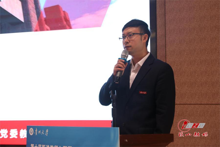 大数据与信息工程学院吴丰呈作为新进教师代表发言。他表示,将心怀坚定信念,不懈努力,谨记“明德至善、博学笃行”的校训,在教书育人的道路上留下自己的足迹,为贵州大学的发展做出自己的贡献。