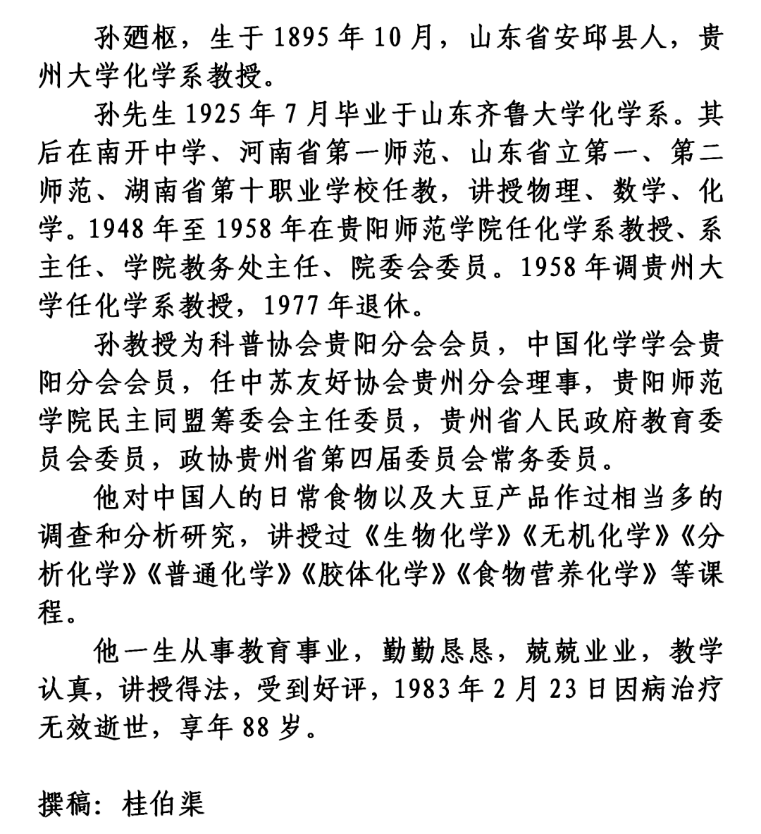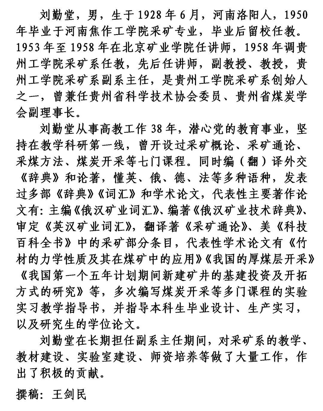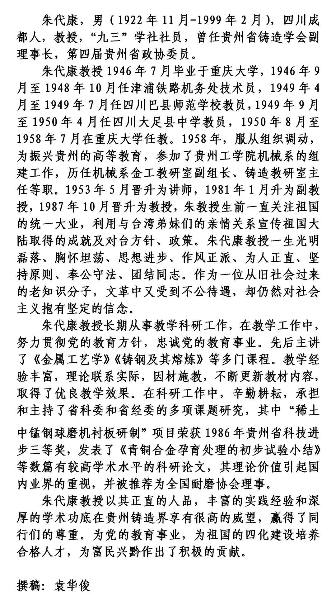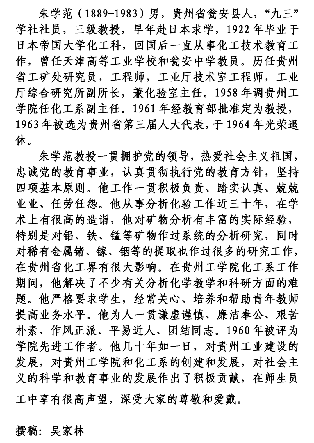 在贵州大学建设和发展的历史长河中,涌现了一大批德高望重,知识渊博,勇攀科技高峰的老师,他们培养了万千学子,创造了贵州大学的历史,书写了贵州大学的辉煌篇章。从他们有形的事迹中,我们看到了无形的精神:强烈的爱国主义精神,忠于职守的敬业精神,身处逆境的奋斗精神,甘为人梯的奉献精神和勇于探索的创新精神。社会在发展,科技在进步,今天的环境、学校规模、专业内容与这些老教授们所处的时代有了很大的变化。他们作为中国知识分子的优秀代表所体现的精神是不朽的,是我们今天还需要大力弘扬的。他们记载了贵州大学曾经的辉煌,我们要以他们为楷模,再创贵州大学新的辉煌。