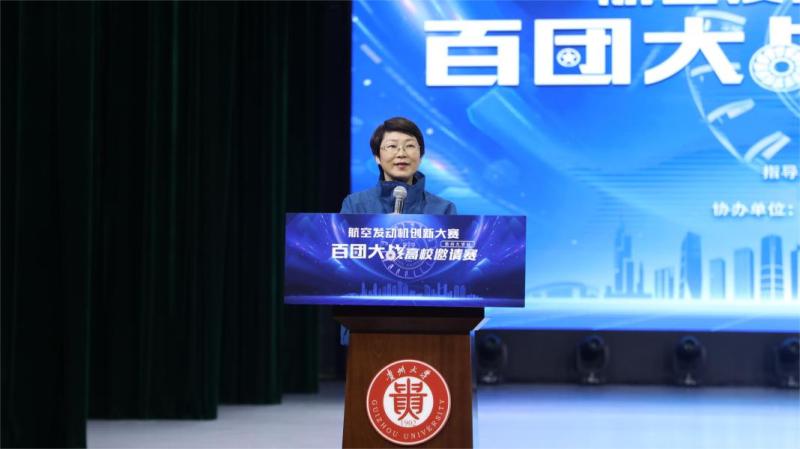 令狐彩桃致辞。她指出,近年来,航发航空发动机“百团大战”高校邀请赛致力于提升青年科技创新能力,在青年科技人才和高校师生之间碰撞、激发出创新的火花,在高校青年学子中反响热烈、深受好评,希望广大师生以本次大赛为契机,在持续创新中增长才干,争做走在时代前列的奋进者、开拓者和奉献者,书写青春荣光。