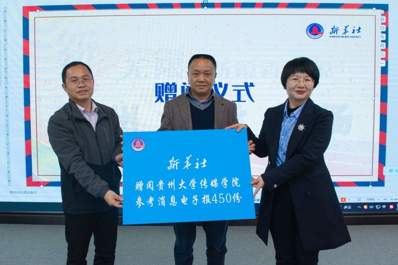 李忠平代表新华社贵州分社向学校捐赠《参考消息》数字报450份,校党委宣传部副部长李旭锋、传媒学院副院长唐娟代表学校接受赠阅。