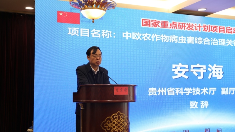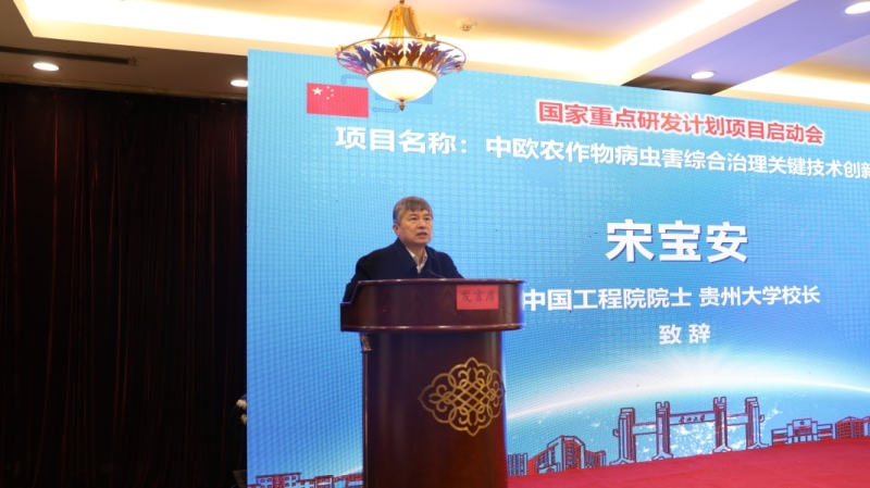 宋宝安在致辞中指出,此项目是我校首次获批国家重点研发“政府间国际科技创新合作”重点专项。他希望,各位专家能够聚焦项目任务,深入交流、广泛研讨、通力合作,致力于农作物病虫害综合治理新技术、新产品的研发、示范与推广。同时,以本次项目为纽带,加强与欧方合作单位的密切交流,优势互补、成果共享,并以此带动申请更多优质国际合作项目,促进贵州大学、植物保护学科建设、昆虫学的发展,进一步提升科学研究水平、提高人才培养质量,为植物保护事业发展和服务地方经济社会发展作出新的更大贡献。