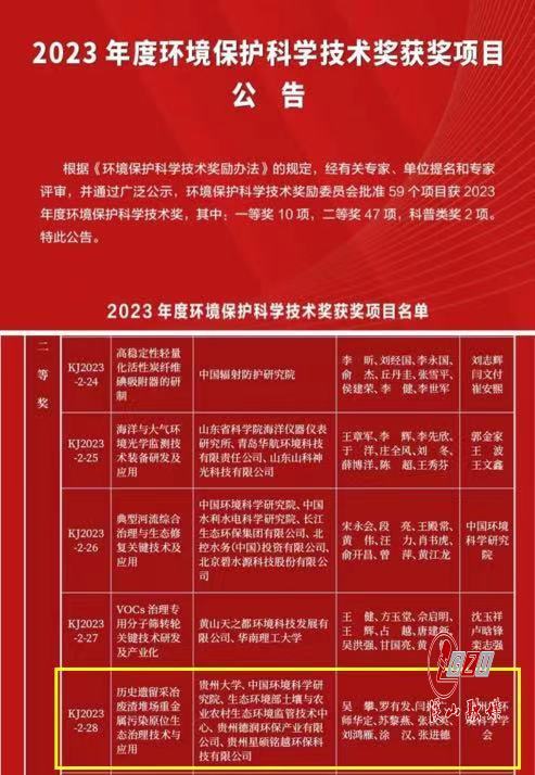 喜报!贵州大学喀斯特地质资源与环境教育部重点实验室获2023年环境保护科学技术二等奖