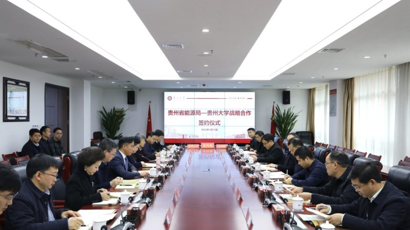 1月15日,贵州省能源局—贵州大学战略合作签约仪式在西校区贤正楼1栋311会议室举行。省能源局党组书记、局长陈华,副局长刘碧雁、姚彤宝,校党委书记杨未、校长宋宝安院士、副校长张大林出席会议,省能源局相关处室及我校相关部门、学院负责人参会。张大林主持会议。
