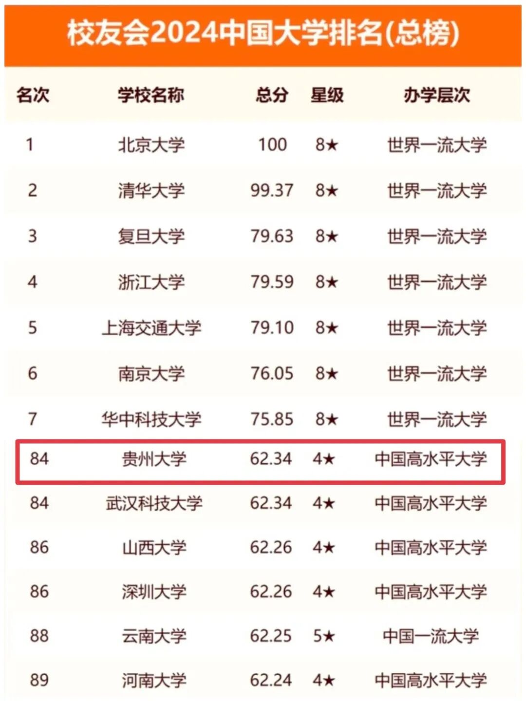 我校排名上升3位!贵州大学在校友会2024中国大学排名(总榜)中居第84位