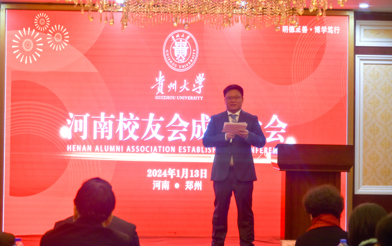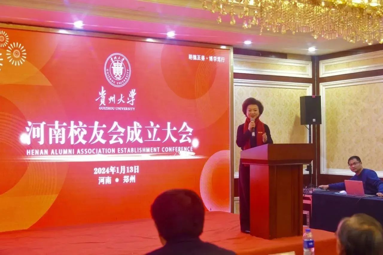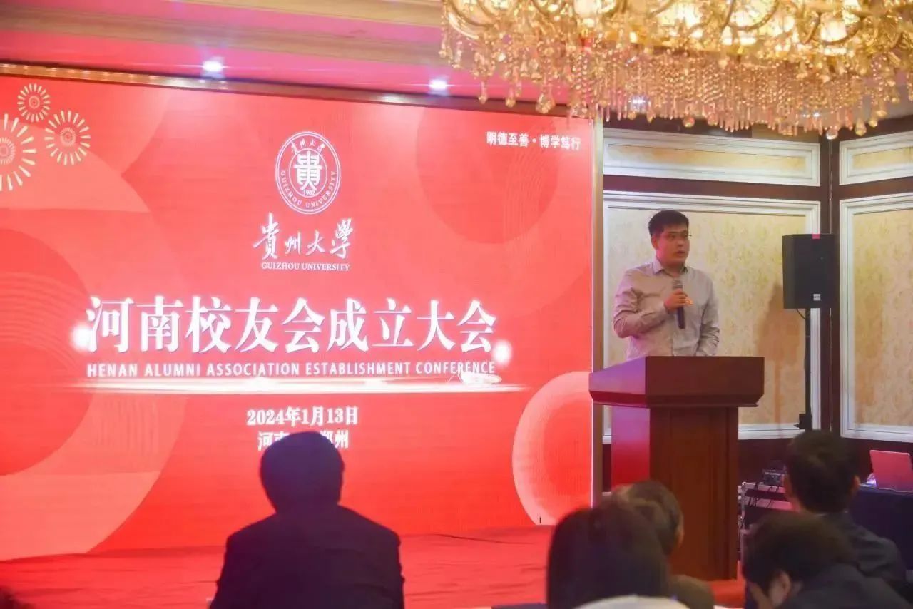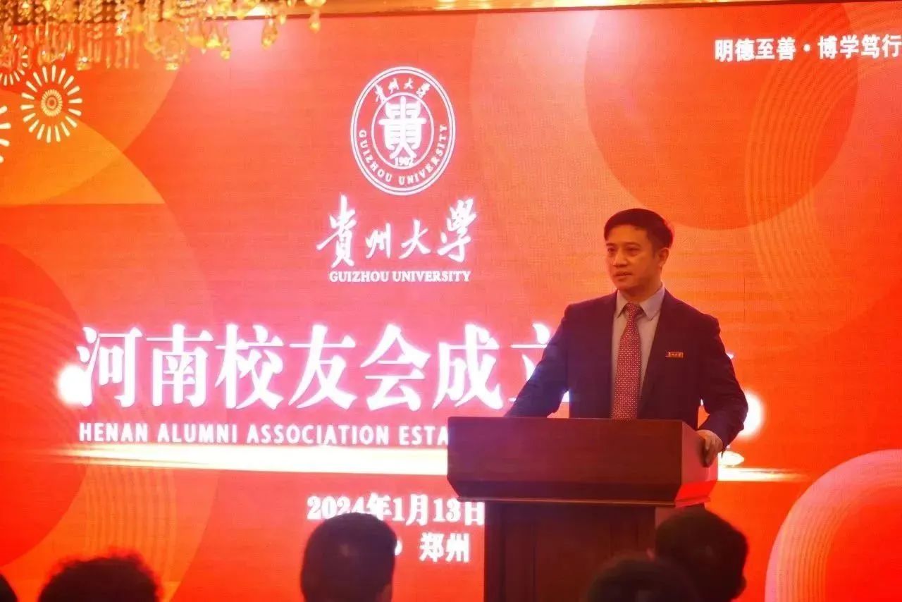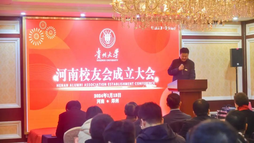 2024年1月13日,贵州大学河南校友会成立大会在河南郑州逸泉国际酒店举行。贵州大学党委常委、副校长张大林,贵州大学对外合作处处长、校友总会副会长兼秘书长刘颖,校友总会副会长、继续教育学院院长任康民,贵州大学河南各地校友代表40余人齐聚郑州参加本次大会。