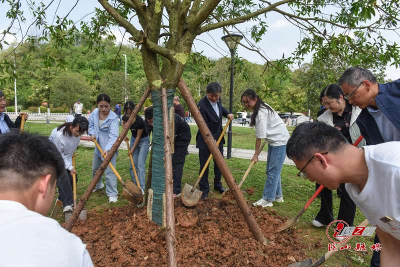 会前,校领导杨未、宋宝安、李飞、王锦荣陪同丁奎岭在西校区院士林与同学们开展院士林植树活动。