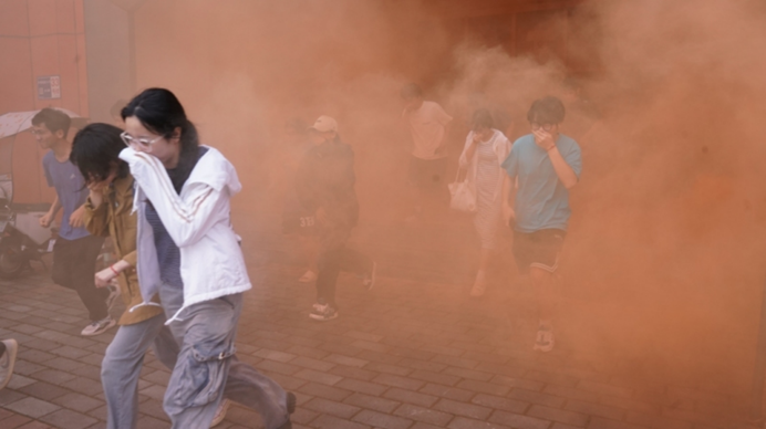 在消防疏散逃生演练开始前,工作人员讲解了火场逃生的注意事项。随后现场模拟了火灾发生的情景,在浓烟滚滚中师生有序地从明义楼疏散逃生,感受了在真实的火场中如何疏散逃生和自救。