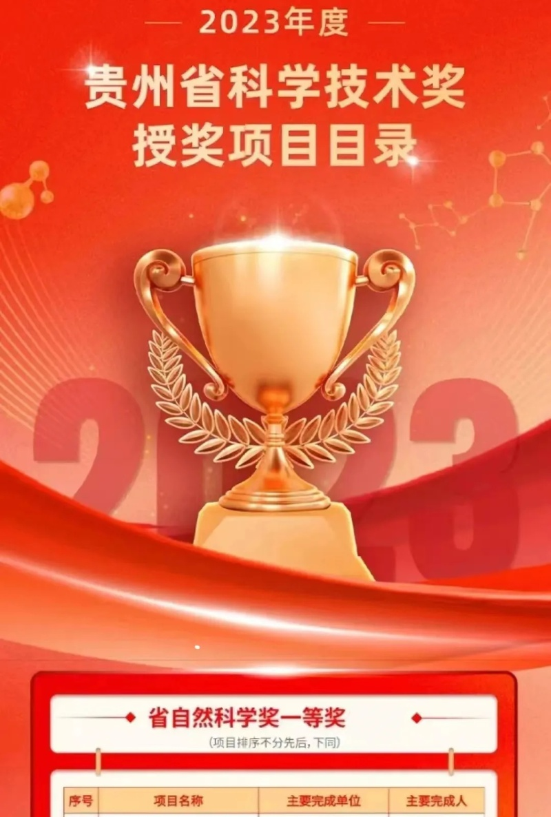 11月21日,贵州省科技大会暨科学技术奖励大会召开。大会颁发2023年度贵州省科学技术奖121项。其中,以贵州大学为第一完成单位的项目获省自然科学奖一等奖1项,省自然科学奖二等奖3项,省自然科学奖三等奖4项,省科学技术进步奖一等奖2项,省科学技术进步奖二等奖4项,省科学技术进步奖三等奖7项。