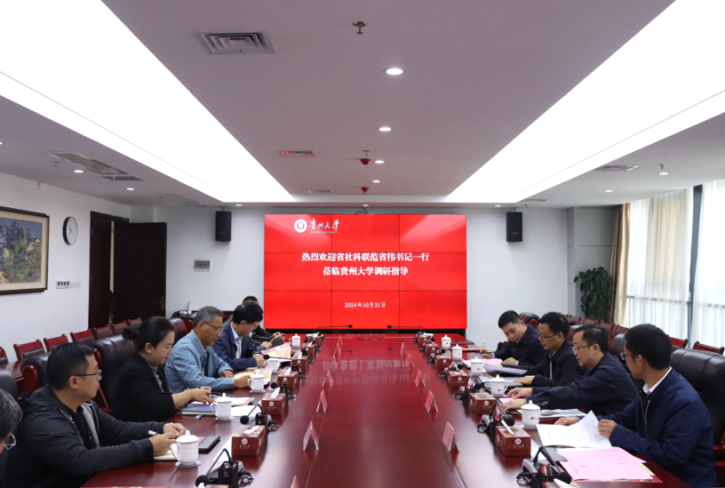 10月31日上午,省社科联党组书记、副主席范省伟一行来我校调研。我校人文社科处负责同志、校社科联负责同志、省哲学社会科学创新团队带头人代表参与会谈,双方重点围绕贵州大学哲学社会科学发展建设情况、参与省社科联项目情况及下一步工作思路和举措等内容展开会谈。会议由我校副校长王锦荣主持。