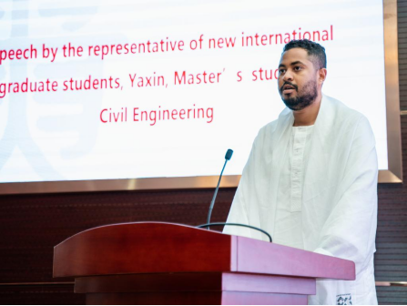 来自苏丹共和国的亚信同学作为本次留学生研究生新生代表发言。他表达了对贵州大学及各位老师的感激之情,对未来的学习生活充满期待和展望。他表示,将珍惜在贵州大学的学习机会,努力提升自己的学术水平和综合素质,将所学所得带回祖国,建设家乡。