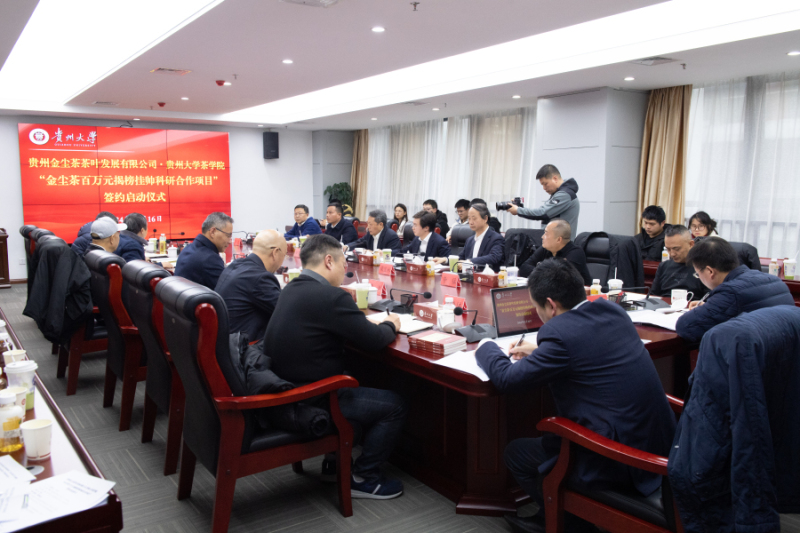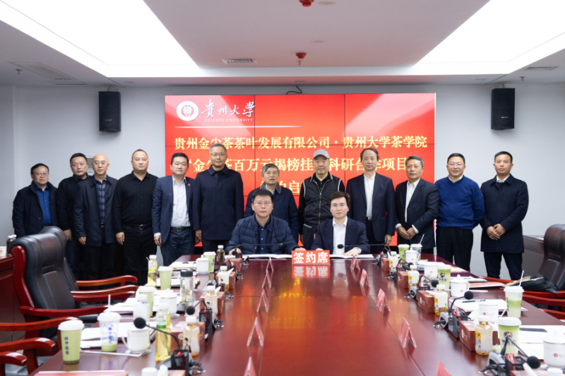 贵州省茶文化研究会,贵州省绿茶品牌发展促进会,我校教务处、对外合作处、科学技术研究院、生命科学学院、茶学院,贵州金尘茶茶叶发展有限公司董事长等单位有关负责人,茶学院师生代表参加签约仪式。