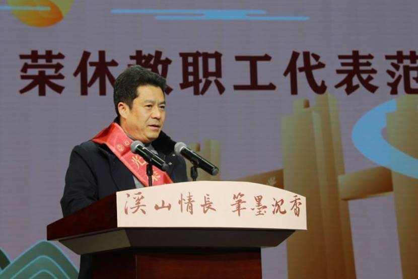 宋宝安代表学校向为学校发展作出卓越贡献的荣休教职工致以崇高敬意。他说:“今天即将荣休的教职工,是见证了学校蓬勃兴盛的一代人,也是推动了学校跨越发展的一代人。我们始终铭记,学校的每一份荣耀都离不开你们的辛勤浇筑,每一次发展都离不开你们的倾心贡献。”宋宝安介绍了学校发展的可喜成绩,肯定了荣休教职工在工作中争先创业、追求卓越的精神。他指出,荣休教职工是学校的宝贵财富,学校将不遗余力地做好教职工荣休后的工作,努力让荣休教职工的获得感、幸福感、安全感更加充实、更有保障、更可持续。同时也期望大家能够以“余热”带动“青春”,帮助青年教师迅速成长,为学校高质量发展蓄能聚势、注入力量。
